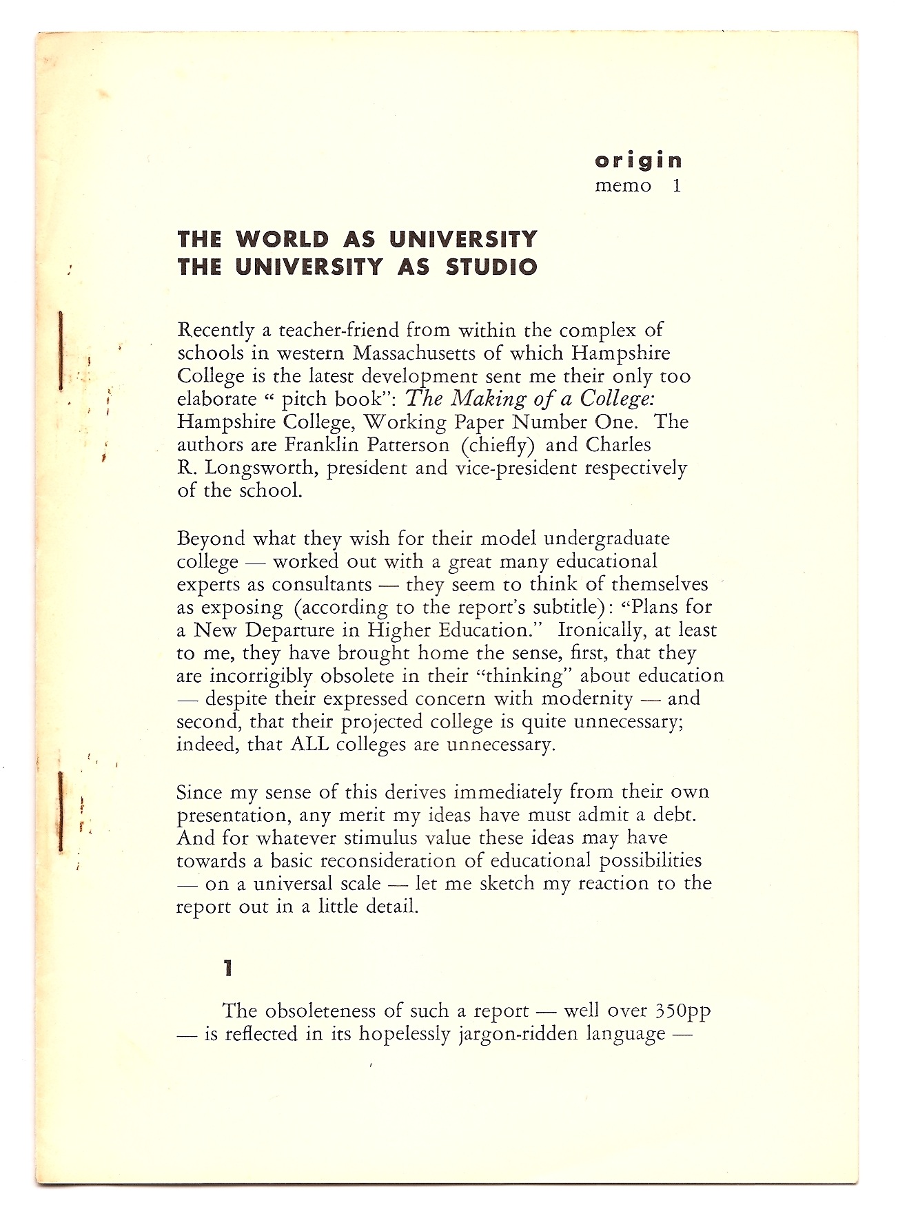 As a contribution to LECTURE HALL.FREE SCHOOL at the Bethnal Green Library, VerySmallKitchen are delighted to make available Cid Corman’s Origin Memo 1 entitled THE WORLD AS UNIVERSITY/ THE UNIVERSITY AS STUDIO, first published in Kyoto, Japan in 1968.