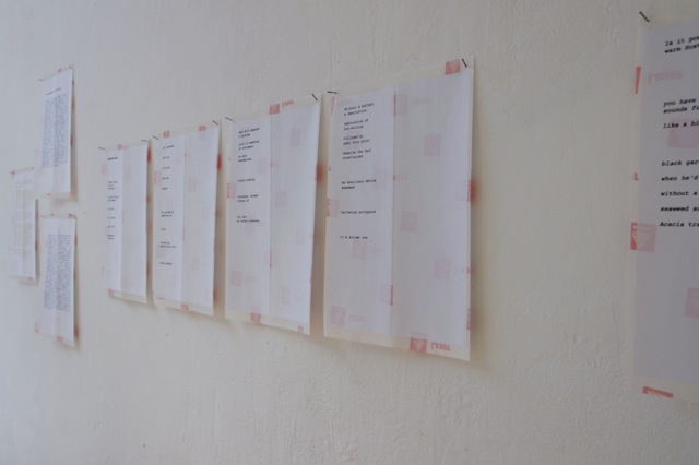 This Dispersal turns the work into a series of personal mementoes, gifts, passwords into the exchange – between the words and the audience – and spreads these out into the space. I like the idea of reversing the process of what we did in june, bringing the words in to the space, and also the idea of materialising the work of the first day of the Shadow in Edinburgh, where the aural experience of the text was the only thing to ‘take with’ from the space. I felt that every line, two lines, combination of lines was potentially meaningful, in theory a simple thought of course, but when I was listening to people reading the text in so many different ways when left to their own devices, I was suddenly quite struck by this.