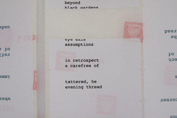 Today and tomorrow are the last chance to see DISPERSALS, an action at the Totalkunst Gallery in Edinburgh that is part of the FESTIVAL OF NEARLY INVISIBLE PUBLISHING. Actually, you might already be too late, if Mirja Koponen’s sticker-poem distribution has gone to plan, and small language pieces have already been taken and dispersed. Or you will encounter the work as it will feature when it arrives at The Pigeon Wing: a sheet testifying to what has been removed and what remains.