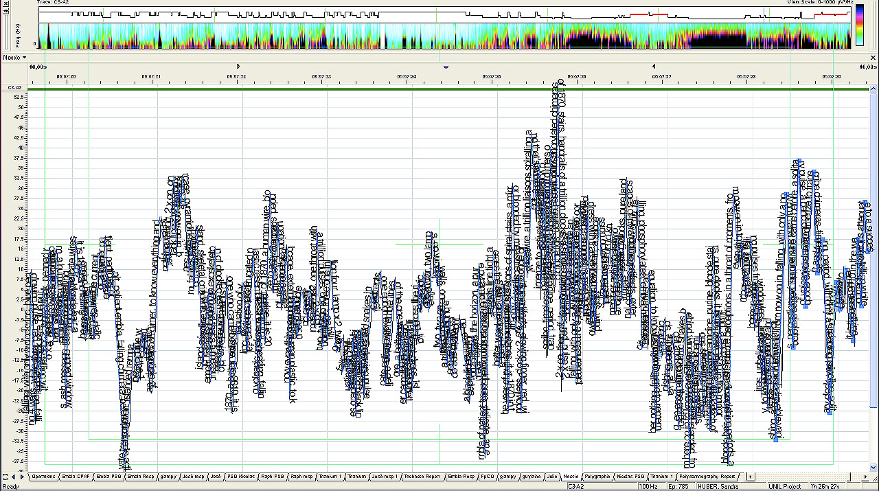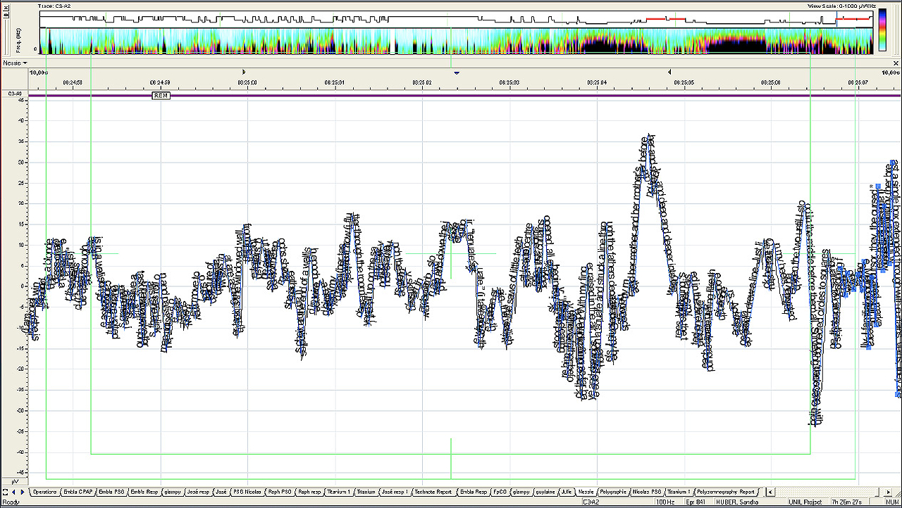 depth. when i say waves, i mean my own and i mean, of course, in sleep. using the self as subject is generally frowned upon in biology: it is taboo to be both researcher and participant, subject and object, author and character, pathologist and pathologized, to be both sides (at once) of the same coin. when i went to the chuv sleep lab, donned that exoskeleton of electrodes, i became of myself another. there is nothing simultaneously more intimate and more unfamiliar than looking into the eeg of one’s own brain. there is nothing simultaneously more intimate and unfamiliar than sleeping. the singular ‘i’ of the waking day