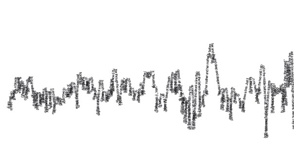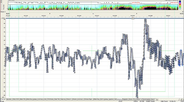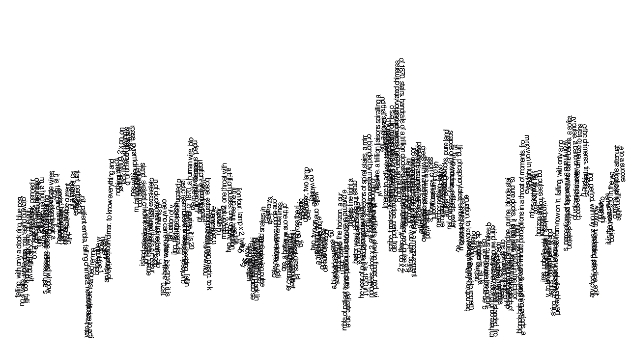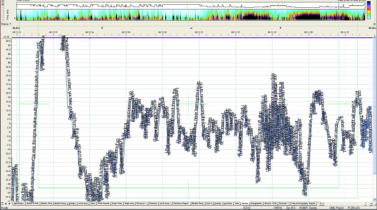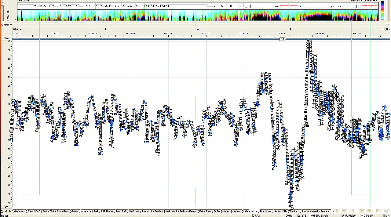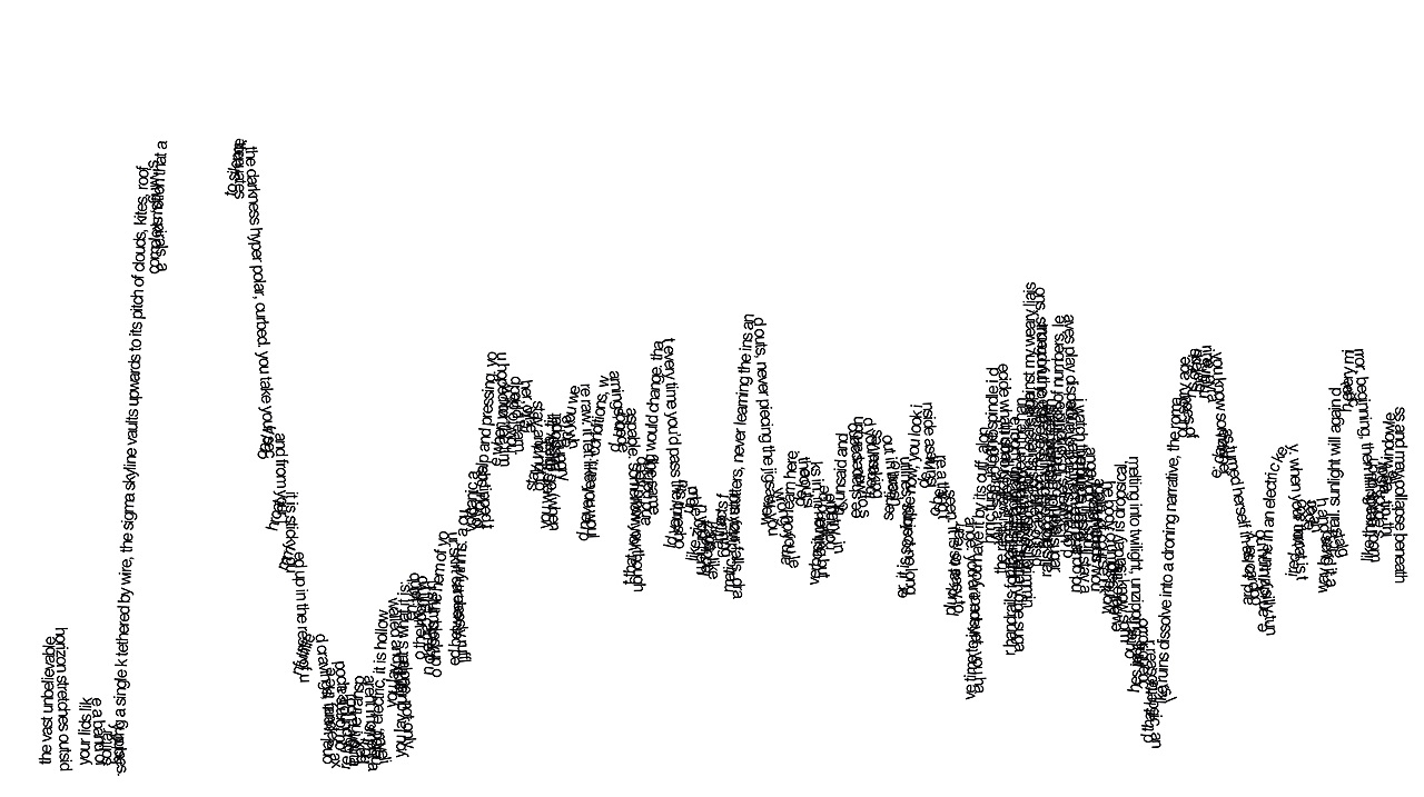 self fades into the plural ‘i’ of the night’s sleeping selves. it is a science and an art (two sides perhaps of the same coin) to develop a (visual) (visible) method of writing to reflect the brainwaves of a sleeping subject. each alpha theta delta and sigma must be put into a series of words and these words form a poem. a student of william james, gertrude stein developed a language/poetics of consciousness itself, severing words from their proper definitions: “act so that there is no use in a centre. a wide action is not a width. a preparation is given to the ones preparing.” hers is a potential model by which to form a poetics of a brainwave. the tropes of repetition and parataxis reflect the repeating structure of the eeg, of our bodies, too, stuck within their own circadian and ultradian rhythms, recurring,