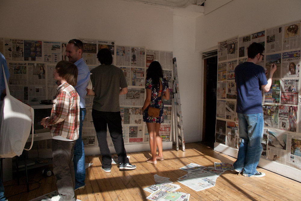 Anyway, I am writing to let you know that no one really photographs your “Newspapers.” I’ve been visiting your piece for about a month now, once a week, sometimes more, depending how lost I am about what to say, and I’ve seen no one photograph it. It’s in the corner of a room, the middle of the second floor, so those factors might lend to a moment of fatigue. The location of your piece is similar to hitting the gooey bottom of a body of water.
