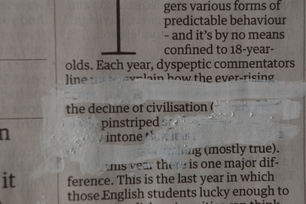 I’m just curious about what discourages “Newspapers” from being looked at. I’ve been watching how most people don’t read the surface of these stacks, and how what you would read feels a little bit like a puzzle to solve. Stopping to solve a puzzle doesn’t go with conveyer belt flow of moving through galleries, even if it is easy, like a travel size puzzle sold in a toy store, one that loses its pieces in between car seats. Also, “Newspapers” is one of the only pieces on the ground in this permanent collection exhibition, and it’s bunched like waste, good-looking garbage, but still associated with what is ready to be brought to the people who sell trash.