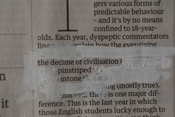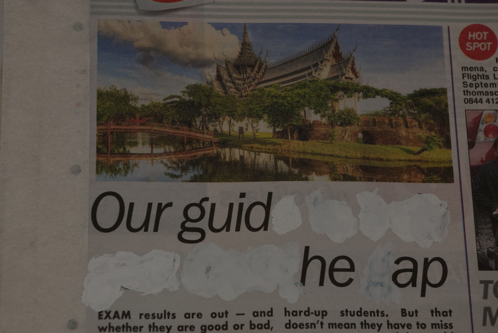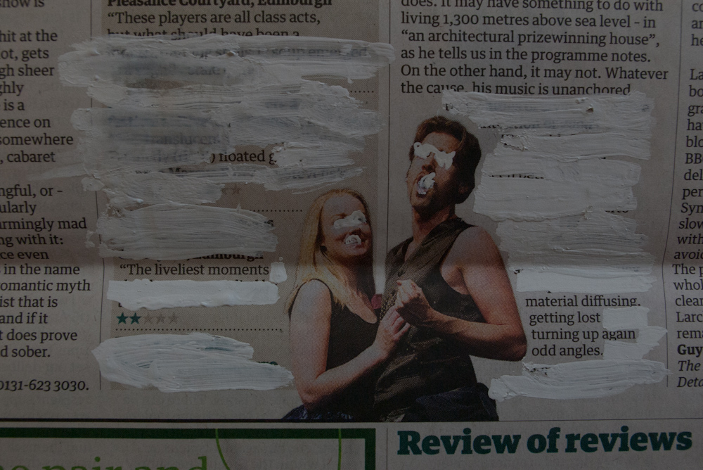 Anyway, the photo of what is maybe Stein and Toklas’ grave or maybe is just a camera pointing at flowers, is “Untitled.” González-Torrez subtitles the “grave” giving an estimate of its location in place, name. There is a concept neatly delivered, or the piece readily contextualized. So it isn’t untitled, that’s sort of a joke. Meanwhile, your “Newspapers,” aren’t really newspapers, so there’s the joke. The hope, maybe I should say. You title them “Newspaper,” single, but I’ve actually been re-titling your piece in the plural, just to make my sentences sound better.