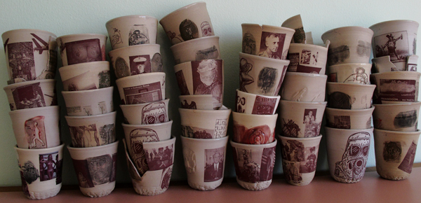 Images feel at home on broken surfaces. Pictures do or don’t remain. By holding pictures on a cup, a hand is holding multiple unoriginal pictures at the same time. The photos are being rounded and hidden. In order to hold the cup, your hand must cover a picture or pieces of pictures. This contact of a palm or the fingers over a picture compares to holding the edges of a print, to see a framed photo, or glance at a screen. The hand to the photo on a cup is both a silencer and amplifier to a picture. We are actively and inactively remembering and forgetting images all the time. We are carrying images all the time. Photos are watching us take them in.
