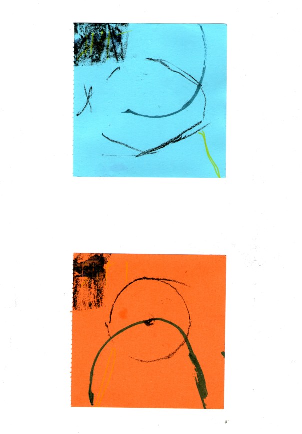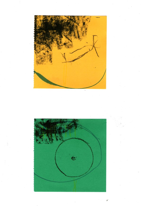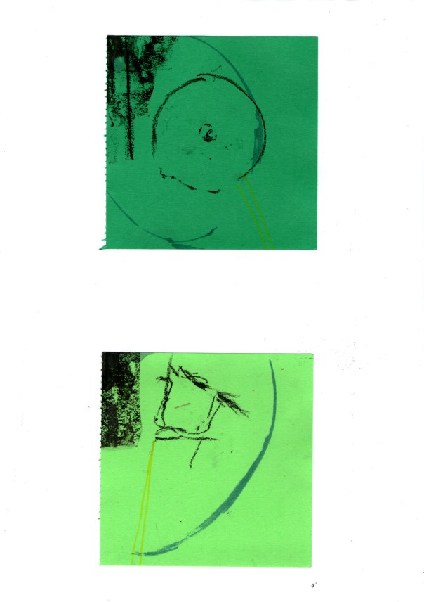 Because it is a string of annotations, it starts with a piece which is an annotation in itself: a reflection on a bpNichol theme. I tried to take into consideration the potentialities of the riso print as well when selecting the works. Ellipsis No. 15 is pale blue – but, if my understanding is correct, it will be pale grey in the print, which is perfect for my purposes. The other pieces are black and white or green and white.