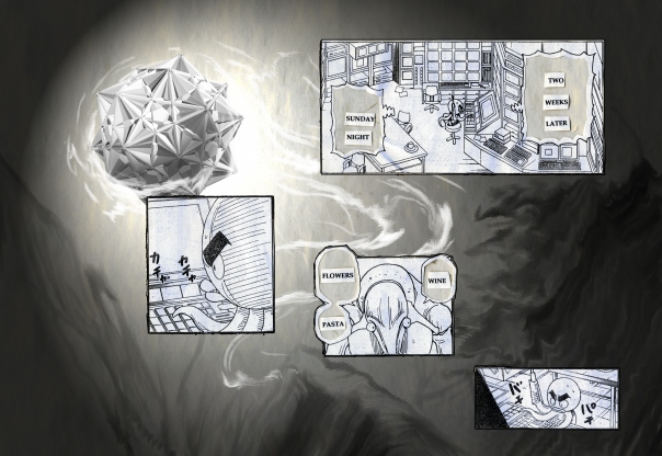 The working title of the book is Evergreen. I’ve numbered the pages (see the file names) in the order I imagined them in the book:
