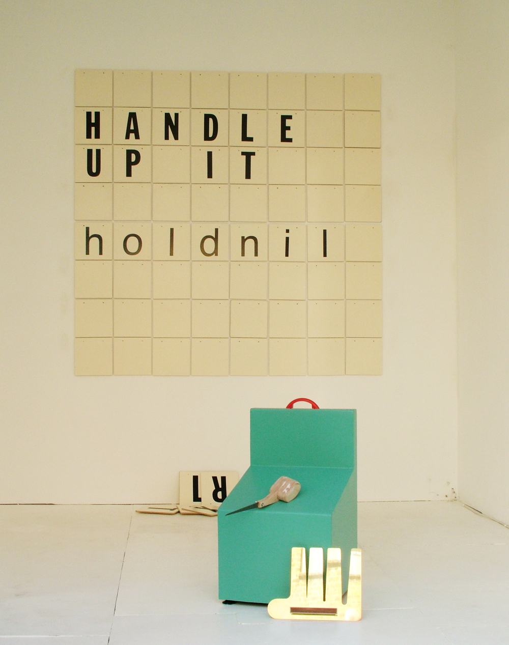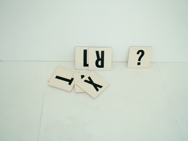 Since the first week of this exhibition (because Dog Man often snuck down from his Watney Market hideout to look ) there has also been, on the back wall of the vitrine, an arrangement of letters on bathroom tiles, hung from nails. Each artist has made a new version of this, adding letters, taking away nails, as suited their aims. Dog Man made his own text for this. You can see it, but I repeat it here: