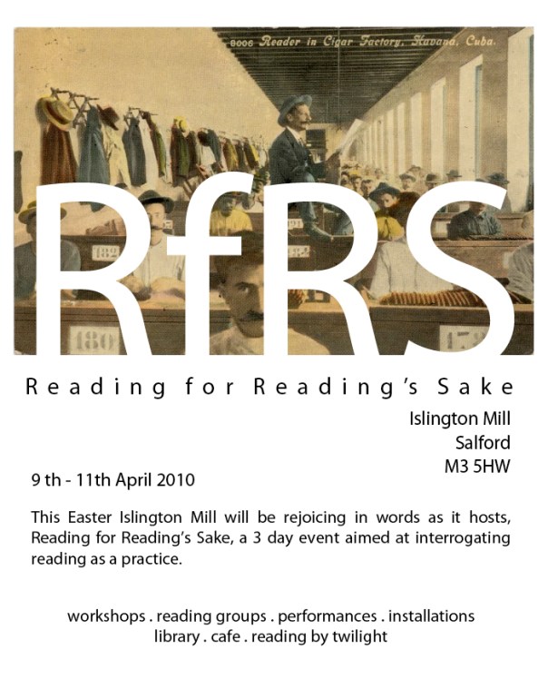 Lerm Hayes essay is structured around the following taxonomy, which serves as a useful taxonomy of Graham’s “reading as publishing” concerns: The Study; Writing (or Not); The Book; The Typewriter, Paper; The Bookshop; Slipcases, Architectures for Reading. “Reading as Publishing” is a term I have been exploring for my presentation and workshop as part of Reading for Reading’s Sake at Islington Mills, Salford, 9-11 April 2010. As Hayes proposes: